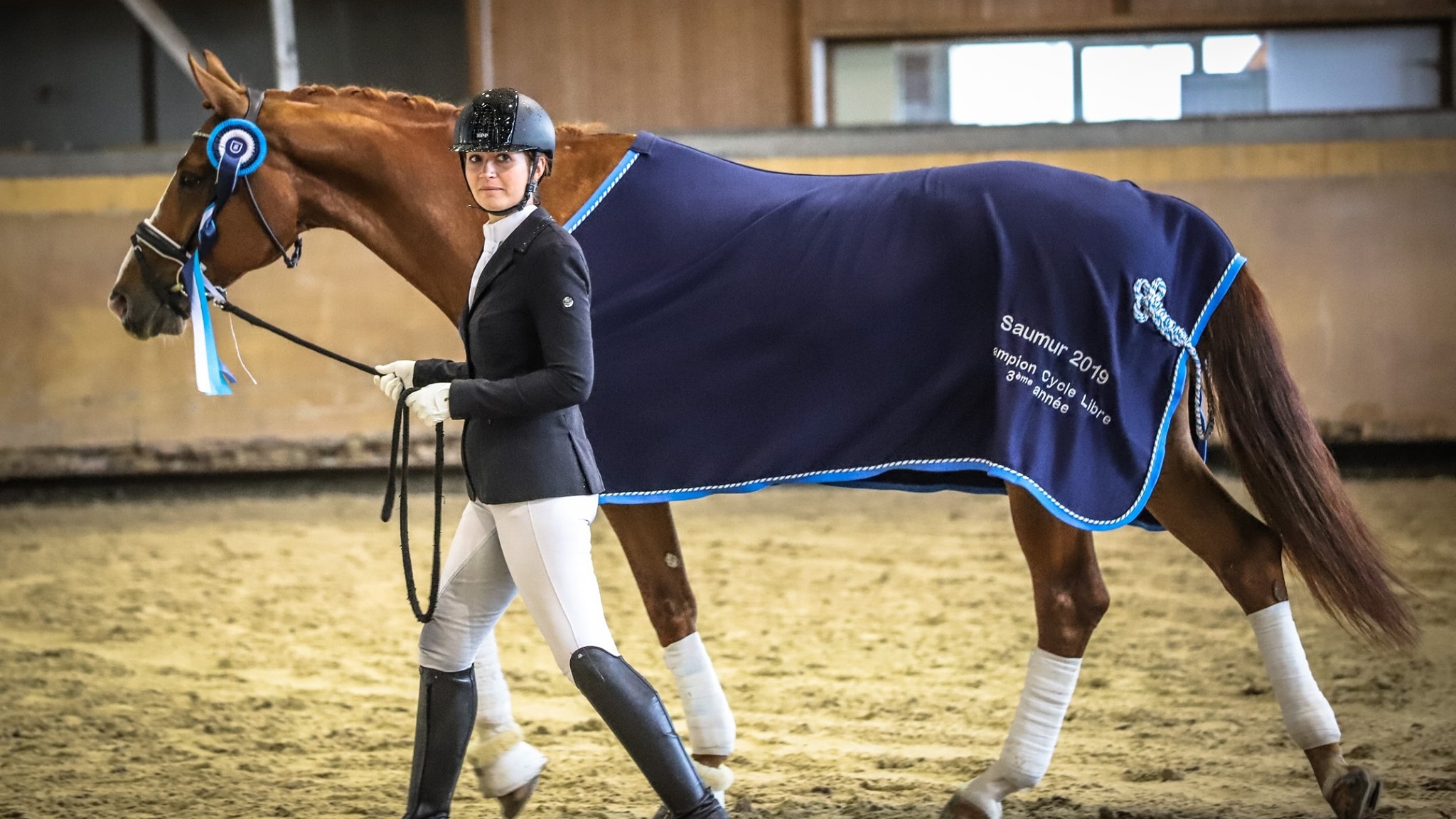 Grâce à une très belle note de 85,40% lors de la reprise finale, Danjano a été sacré Champion de France du Cycle Libre 3ème année aux agiles commandes d’Alice André. Né chez Holger Mickenhagen, le fils de Depeche Mode et Figra SF, elle-même fille de Fidermark, n’a pas raté grand chose cette saison. Sur cinq reprises présentées avant la Grande Semaine de Saumur, le hongre alezan a été sacré quatre fois meilleur de sa catégorie, de quoi ravir sa cavalière et propriétaire Alice André : « À quatre et cinq ans il n’est pas sorti en concours car il était un peu inquiet et un peu sur l’œil. Nous avons préféré prendre notre temps et évoluer à la maison avant de l’emmener à l’extérieur. Cette année, nous nous sommes dit qu’il était prêt et que c’était le bon moment. Il a réalisé une très bonne première saison. Au départ, lors des premiers concours il était un peu angoissé, mais il a tout de suite plu aux juges recevant à chaque sortie de très bonnes notes ! À Saumur, il a été un peu compliqué car son coté émotif a fait qu’il était très impressionné. Nous avons donc essayé de nous en occuper le plus et le mieux possible, en lui faisant faire de bonnes détentes, en le marchant régulièrement pour qu’il s’habitue à son environnement et se rassure. En le gérant comme ça et en ne faisant que des petites séances pour calmer l’angoisse mais garder sa fraicheur, nous avons réussi à l’avoir très bien lors des épreuves et il a été génial. Désormais nous devons confirmer les changements de pieds et continuer à travailler le rassembler. Nous ne voulons pas brûler les étapes, nous avons seulement un objectif de formation pour le futur et pour les plus belles épreuves », détaille Alice André.