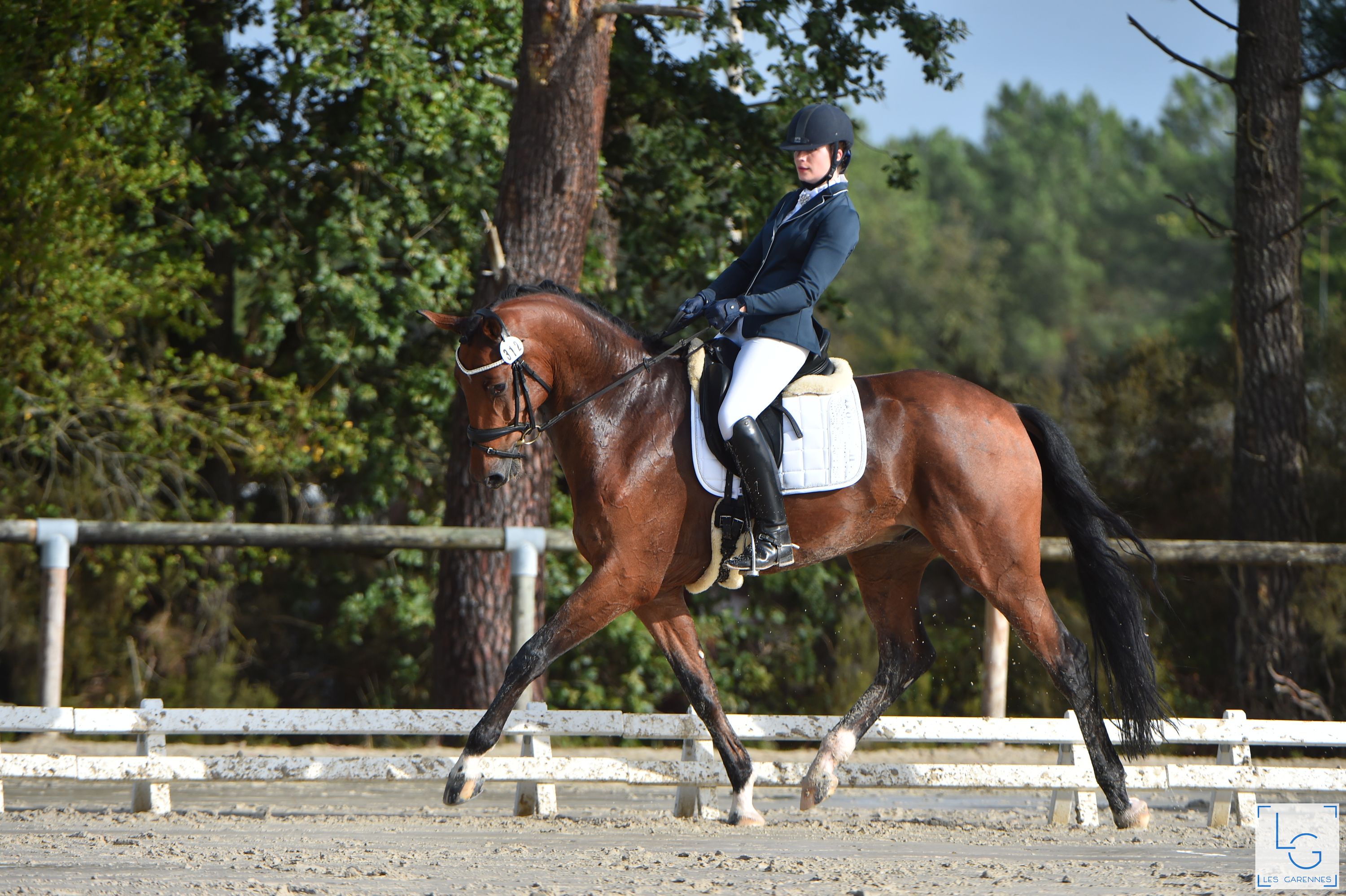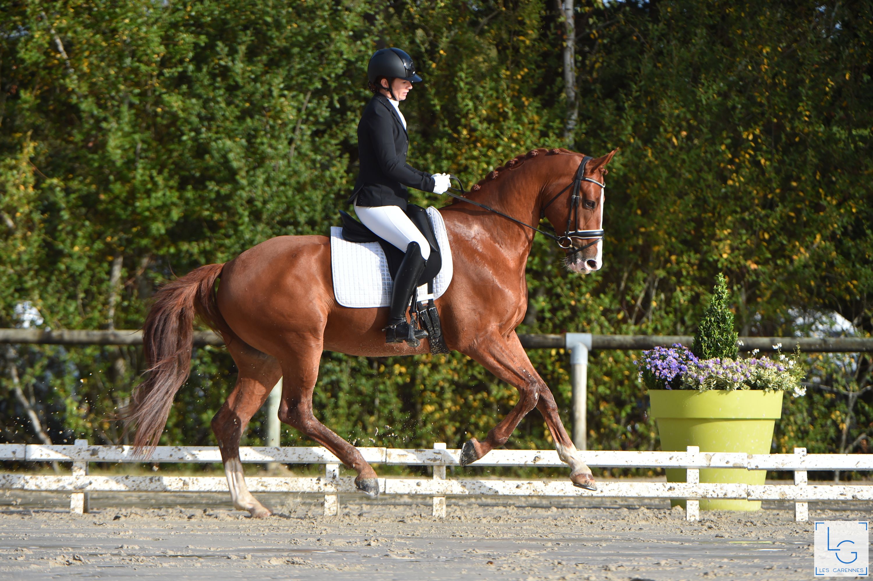 Iquando, accompagné d’Anthea Saux, grimpe sur la deuxième marche du podium grâce à un score de 82,90% accordé par les juges lors de la reprise finale. Né chez Monsieur Van de Laar, le KWPN fils de Krack C et Turjazzila, elle-même issue de Jazz, se pare d’argent pour sa première participation à la Finale du circuit Cycle Libre. Si aujourd’hui le hongre bai semble assagi, cela n’a pas toujours été le cas comme le raconte sa cavalière et propriétaire Anthea Saux : « J’ai acheté Iquando en 2016 alors qu’il avait trois ans. J’ai été le choisir avec mon père, Christophe Saux, aux Pays-Bas. J’en avais alors essayés beaucoup, mais j’ai eu un coup de foudre pour celui-là et surtout lorsque je suis montée dessus ! Il était hyper agréable à monter, j’avais aussi vu qu’il était très sensible et que j’allais probablement beaucoup tomber, mais il disposait de superbes allures et de beaucoup de souplesse ! Il savait déjà rassembler le galop à trois ans… À quatre et cinq ans je ne l’ai pas beaucoup sorti justement car il était assez chaud et, en concours, il était très impressionné et cela rendait les choses compliquées. Ayant un autre cheval, je l’emmenais avec nous en compétition afin qu’il découvre les terrains etc… Nous n’avons commencé les concours que cette saison en Cycle Libre et nous avons remporté toutes les épreuves auxquelles nous avons participé. À Saumur, lors de la première épreuve, Iquando était très impressionné et se retenait énormément. Dimanche, j’ai eu une détente très compliquée où il était très chaud et ai même dû descendre en cours de détente pour le longer. Nous n’étions donc pas dans des conditions optimales pour réussir notre finale. Il a néanmoins été bien sur le rectangle », souligne la cavalière.